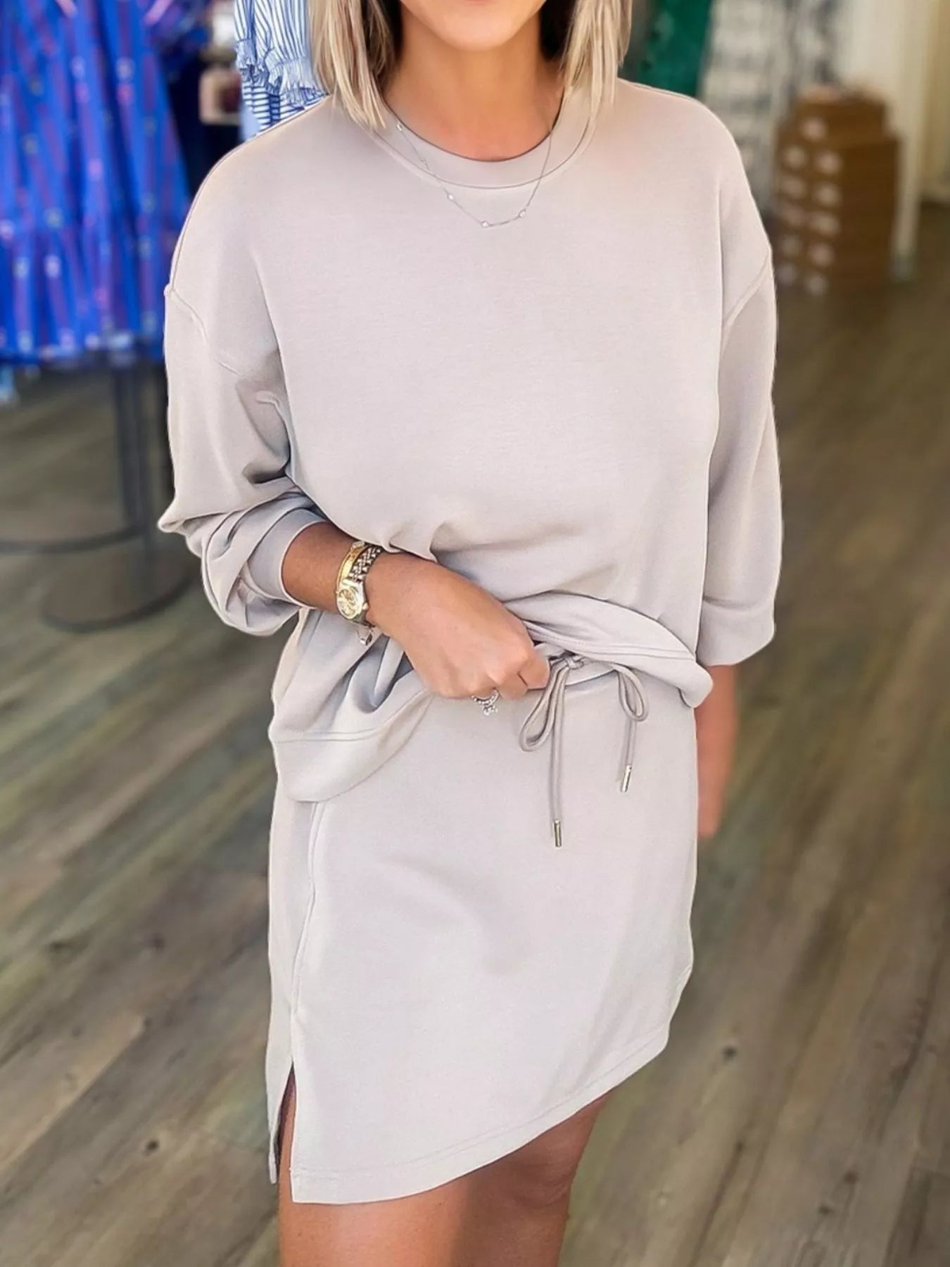 Solid Color Drop Shoulder Pullover and Drawstring Mini Skirt 2pcs Outfit